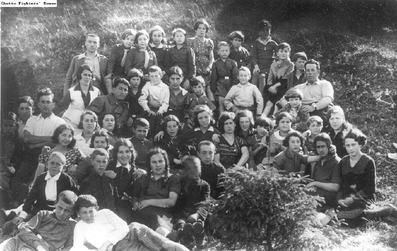 Summer camp of the He - Chaluts Ha - Tsa'ir youth movement in Linkuva. Photographed on August 19, 1935 (several participants identified as below)  Summer camp of the He - Chaluts Ha - Tsa'ir youth movement in Linkuva. Photographed on August 19, 1935 (several participants identified as below) Photograph from Archives of the Ghetto Fighters' House (http://www.gfh.org.il/english/) with permission  1 2 3 4 5. Beila Gurevitch. See also Families Fabran, Gurvitz and Horowitz from Linkuva 6. Masha (? Mirriam) Mer. "Mother had died. Father not from Linkuva but lived there." ? Father Binjomin. 7 8. Israel (Srolke) Joffe. Emigrated to USA ? 1936. 9 10 11 12 13. Sheina Landsman. Parents had "dry goods store". "Family was poor people". Parents Jacob and Leiba. Brother Srolka. 14. Eta Mann (see sister in other picture 6337) 15. Simon Civjan's Sister Rochel 16 17 18. ?? spouse (later) of Chana Belker 19. Sonia Kapuler. "Married first cousin Aba Klein who was a physician, graduated in France" 20 21 22 23. Hienka Gurvits (see also photograph second from top on Families Fabran, Gurvitz and Horowitz from Linkuva) 24. Chana Belker ? Married 18. Sister of Beila Belker, Father Messa Belker 25. ?Pesa Sulat (sister of 29) 26 27. Beila Blecher ("Lives in South Africa, now Singer") 28 29. Eta Roche Sulat ("? still living in Israel. Parents baked good bagels.") ? Sister of 25. 30 31 32 33 34 35 36 37. Belle Joffe ? 1st cousin of Bela Blecher (? Her mother and Beila's father are siblings) 38 39 40. ? a Lurie family member 41 42 43. ? Gita Schlosberg, ? has daughter in Canada; ? her mother and Leo Kahn were siblings 44 45 46 47. ? a Teacher 48 49 50 All identifications and comments by Simon Civjan. Photograph originally obtained from Haya Yaakobi [Table of Contents] [Background - Journey to Linkova] [The Journey to Linkuva] [Photograph Gallery - Linkuva, Lithuania] [Maps of Lithuania] [Blumsohn tree] [Linkuva Directory] [Linkuva and Holocaust Resources] [Audio testimony - Murder in Linkuva] |