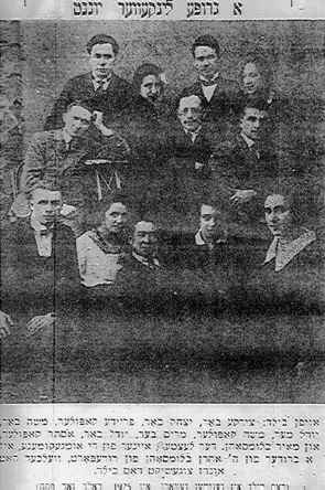 A picture of several young people from Linkuva taken in 1925. From "Afrikaner Yiddisher zeitung 3 April 1953" : A group of young people from Linkuva Zadik Bar, Yitzchak Bar, Frieda Kopelar, Moshe bar, Yudel Mer, ( meir), Moshe Kopelar, Miriam Bar, (spelt bet ayin Resh- the others are bet aleph resh), Ester Kopelar, and Meir Blumsohn. Der loster (?others) eine von der ongekomende, un a broder von Ch.' Aharon Blumsohn von Roodeport! This was taken in 1925 after Pesach ( nog Pesach).