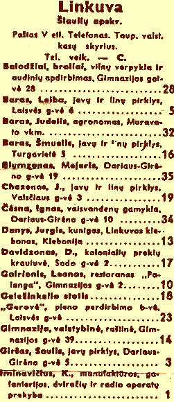 On the 14th of April, 1996, I went with my sister Cecilia (Cissy, Tzilla) Meroz from Israel to Lithuania - Lita, Der Heim. Our father, Aaron Blumsohn, z"l and a"h, had come from Lithuania to South Africa in 1927 and our maternal grandmother (Tilly, nee Boner) and grandfather (Charles Tannenbaum), z"l and a"h, had lived in Kelme and Pinsk (White Russia) respectively, and had come to South Africa in the late 1890s. My father, Aaron a"h, who passed away in 1957, had told us episodes of Linkuva and of life there, dominated by poverty and Yiddishkeit, but it always seemed to me as something unreal, something of the very distant past, a lost world. I, as a young child, remember him weeping and mourning for his father, z"l and a"h, who died in 1937: he received the news in a letter in Yiddish many months later, I think. And I remember his horror at news of the unbelievable Holocaust, in which many of his family perished. I, of course, remember my mother, Leiba's , z"l and a"h, parents too: I lived with them in Roodepoort. They too came from Der Heim; but many years earlier. One could not visit Lithuania during or after the war, and, in fact, not till the early 1990s, when Lithuania became independent from Russia. I really wanted to go, with no expectations or preconceived hopes of finding anything or anyone at all. I just wanted to walk on the ground of the shtetlach in Lita, to breathe the air and to dream of what was in a vanished, destroyed world. In spite of Lita being a graveyard, ghettos, cemeteries and Holocaust for the Jews, deep inside, I wanted to be there. I had read the history of the Lithuanian Jews, notably in Masha Greenbaum's book The Jews of Lithuania: A History of a Remarkable Community 1316 - 1945 (Jerusalem 1995/5755, Gefen Publishing House Ltd.) In Johannesburg, I visited a Mr. Eli Sament and his wife. He had written an article in the South African Jewish Times on a visit to Lithuania. His main destination was Zagare, which is not far from Linkuva. He published a photograph of the Shul in Linkuva, and he wrote of their guide, Regina Kopilevich. I visited Mr. Sament with Mr. Natie Aremband whose family had come from Linkuva. I had obtained copies of some of the archives of births, marriages and deaths from Pakroi, a town very near Linkuva [See Map]. Pakroi seems to have been where records of these events in Linkuva were made. The names of Aremband and Nochumsohns and Blumson and Borkum and Blecher and Girsh appear here. I will refer to these later. On Saturday night, Chol Hamoed Pesach, 6th of April, I flew to Israel to visit my sister, Cissy Meroz, and her family. We spent a wonderful week together. To Lita We went to the airport at about 3 in the morning, and flew Lufthansa to Vilnius (Vilna) with a stop in Frankfurt. Cissy had her visa; I was told that mine would be awaiting me at Vilnius airport. At Ben Gurion airport, they did not want to allow me to board, as I did not have a visa with me, but they eventually did. At Vilnius, there was no record of my visa. The authorities were firm and would not let me into the country. We spent a few worrying hours. Later, when we returned to Israel, Cissy found at her work (Joint Distribution Committee, JDC in Jerusalem) the official faxed surety that my visa was in order. The airport was drab and sparse, cold and cheerless, with only bare necessities - a reminder of the long-standing Russian influence. I had asked my travel agent if she could arrange for Regina Kopilevich to be our guide. Regina is 31 and Jewish. Her parents came from St. Petersburg, Russia, to Lithuania long after the war. She is friendly, charming, helpful and gentle. She knows her Lithuania, and she knows the Jewish community in every town, and they all know her and love her. She knows Lithuanian, English, Hebrew, and Yiddish. She spent all the eight days with us. She has a mother, whom we did not meet and a sister, Dina, a pharmacist, who later took us to Trakai in her car. Vilna (Vilnius) Regina took us to our hotel, the Neringa in Gedimino pr. It was near to most of the places we went to in Vilna, walking distance or walk plus a bus or two - the buses are very cheap. Neringa was comfortable, our rooms were airy and clean and it was reasonably priced. The staff were friendly and helpful. We drove from the airport through the old city. The buildings are old, austere and drab, there are large churches and belfries, the streets are cobbled, and women sweep up the dirt and dust and snow from the streets into many small heaps. It was wintertime, but not too cold. It did not snow, but there was lots of as yet unmelted snow on the ground everywhere we travelled. We had brought our own food - manot chamot - dried vegetarian meals to which we added boiling water, cereals, cheese, tinned sardines, polony, - so we bought bread - dark black bread, and we ate boiled eggs, coffee, jam, honey, herring and potatoes (blattos), radishes, borscht and blintzes and fruit. Next day and the following day, we toured Vilna - mostly on foot, with a bus on occasion. We saw churches, the opera house, government buildings, monuments to Vytautis the Great and other rulers, and we walked among the people. We walked among outdoor stalls selling fruit and flowers; we went to the telephone exchange; we went to a bank and changed money into Lithuanian Litas. The museum is really three museums. Firstly - a museum honouring the Righteous Gentiles, some of the few Lithuanians who helped Jews in their dire distress. There are heartrending stories told in detail. There is a wonderful photograph of Mrs. Landsbergis, President Vytautas Landsbergis' mother, who was a righteous gentile, and a monument to a Japanese and to a Dutch consul, both righteous gentiles. The second museum houses relics from some of the magnificent old Shuls of Vilna - only a few saved from the brutal destruction at the hands of the Nazis: parts of sifrei Torah, mantles, pointers, menorot, doors of the Shul and of the aron kodesh